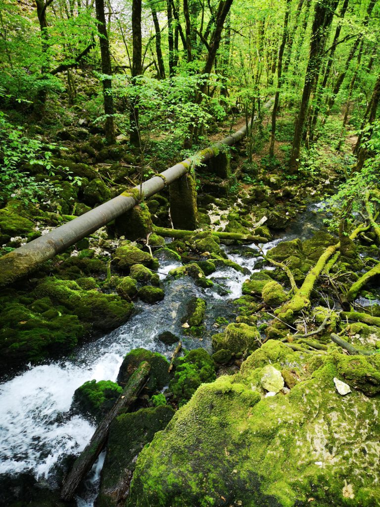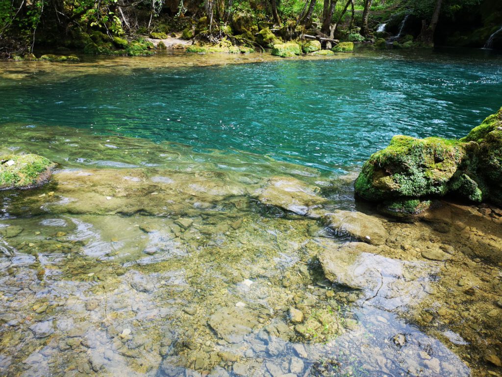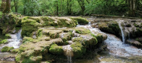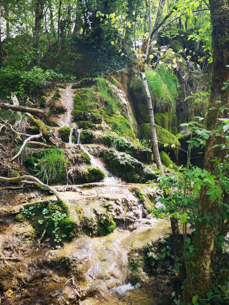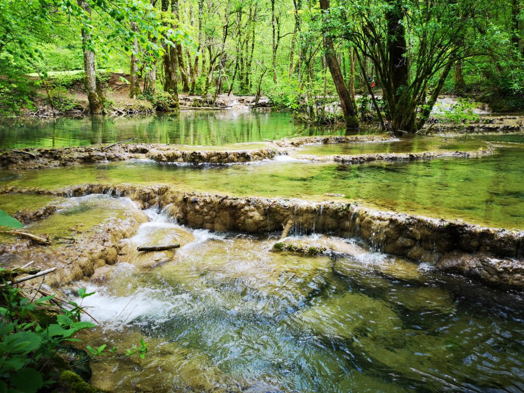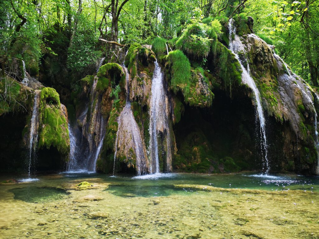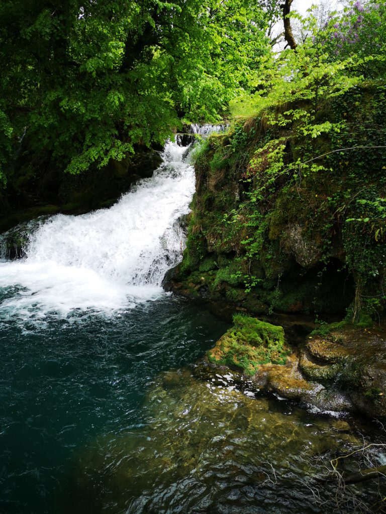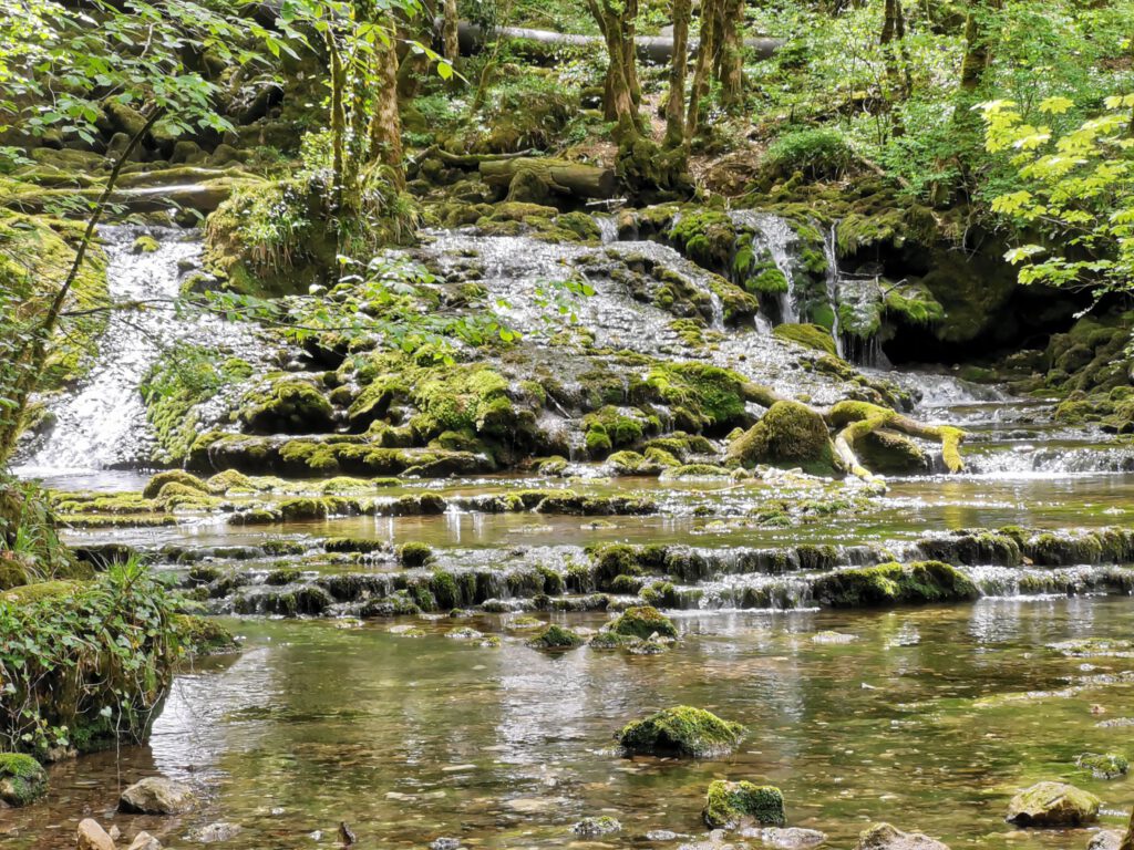 Aber sonst ist der Bereich des Wasserfalls schon richtig schön, wahrscheinlich wegen der aktuellen Trockenheit nicht ganz so imposant, aber sehr sehenswert. Man kann dem kleinen Fluss „La Cuisance„ ca. 100-200m weiter nach oben bis zu Quelle folgen, unterwegs immer wieder kleine Wasserfälle, einfach toll. Man sieht, dass zu anderen Zeiten wahrscheinlich mehr Wasser fließt, denn einige kleine Zuflüsse führen aktuell kein Wasser. Zu anderen Zeiten sieht es mit Sicherheit noch einmal eindrucksvoller aus.