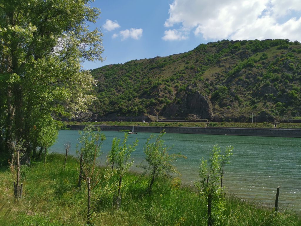 Bis „Tournon“ haben wir dann wieder von den anliegenden Orten kaum was mitbekommen, sind fast vollkommen isoliert vom Autoverkehr, nur ab und an nutzt der Weg vorhandene kleine Straßen mit. An den Hügeln links und rechts tauchen immer häufiger Weinberge auf, teilweise ist die Landschaft schon fast malerisch. Die Oberfläche des Radwegs ist meistens gut fahrbar, die Sonne scheint, der Wind schiebt von hinten, ein leichtes Gefälle stromabwärts hilft auch, die Rhône neben einem, so kann man es aushalten…