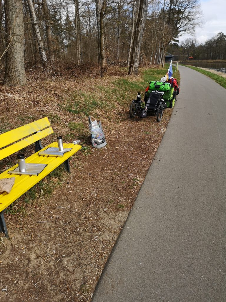 Nach ungefähr 1,5 Stunden kommen wir dann an die Ems und es geht bzw. rollte auf den Ems-Radweg, wo wir dann auch Pause machen. Und hier dann auch der erste echte Lichtblick: die Sonne scheint, es ist fast windstill – nach den unschönen ersten beiden Tagen, wo wir im kalten Wind nur schnell was gegessen und getrunken hatten, ist das hier eine Wohltat, Labsal für die Seele. Selbst mein Knie und meine Archillessehne sind zwar merkbar, aber kein wirklicher Grund zur Sorge.