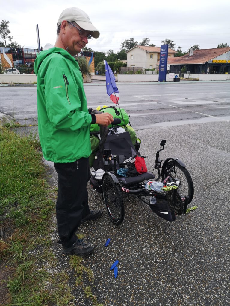 Mitten in „Biganos“ ist dann plötzlich auch noch mein rechtes Vorderrad platt, nach knapp 2000 km ohne Panne bei beiden Trikes. Also anhalten, Schlauch wechseln und weiter, zum Glück ist es gerade einigermaßen trocken.