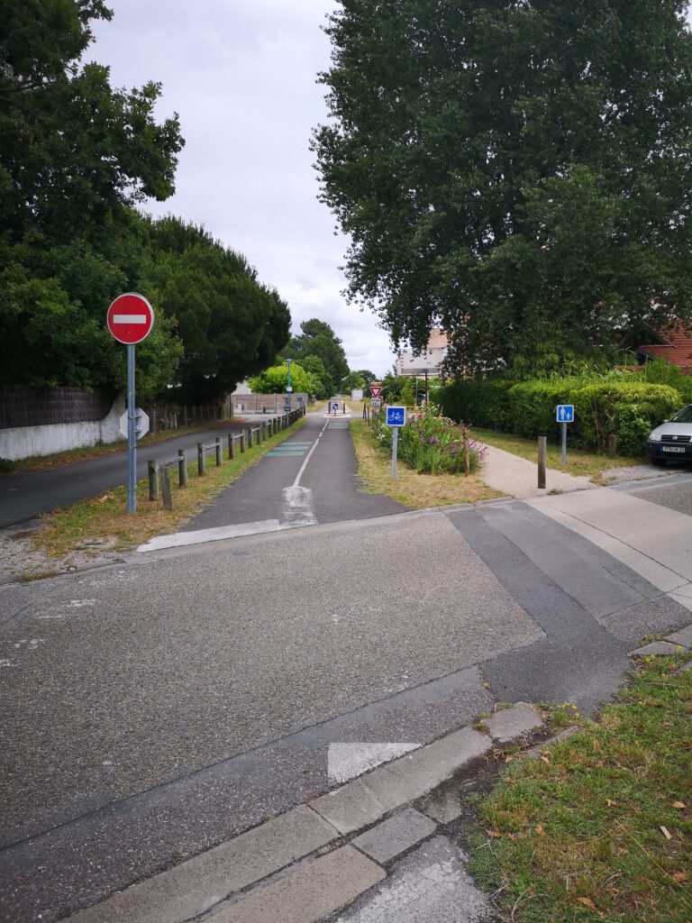 Dann kommen wir nach „Biganos“, wo wir uns schon etwas an die Strecke, wo wir auf „Cap d’Adge“ zugefahren sind, erinnert fühlen. Total der krasse Gegensatz zu vorhin: der sehr schmale Radweg an den Straßenrand gequetscht, abgetrennt durch eine Betonkante, schlechte Oberfläche und dann noch ständiger Seitenwechsel. „Biganos“ hat hiermit für diesen Bereich ganz klar die Note 6-, 0 Punkte, verdient!