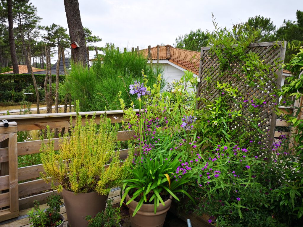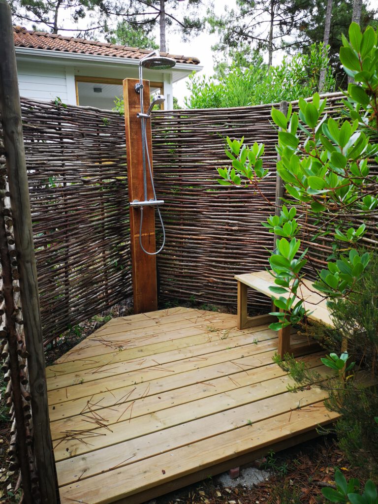 Es ist zwar nur ein Zimmer, aber es jat eine sehr schöne, große Holzterrasse mit vielen Pflanzen, eigenen Liegen und neben dem Haus ist auch noch eine schick gemachte Außendusche.