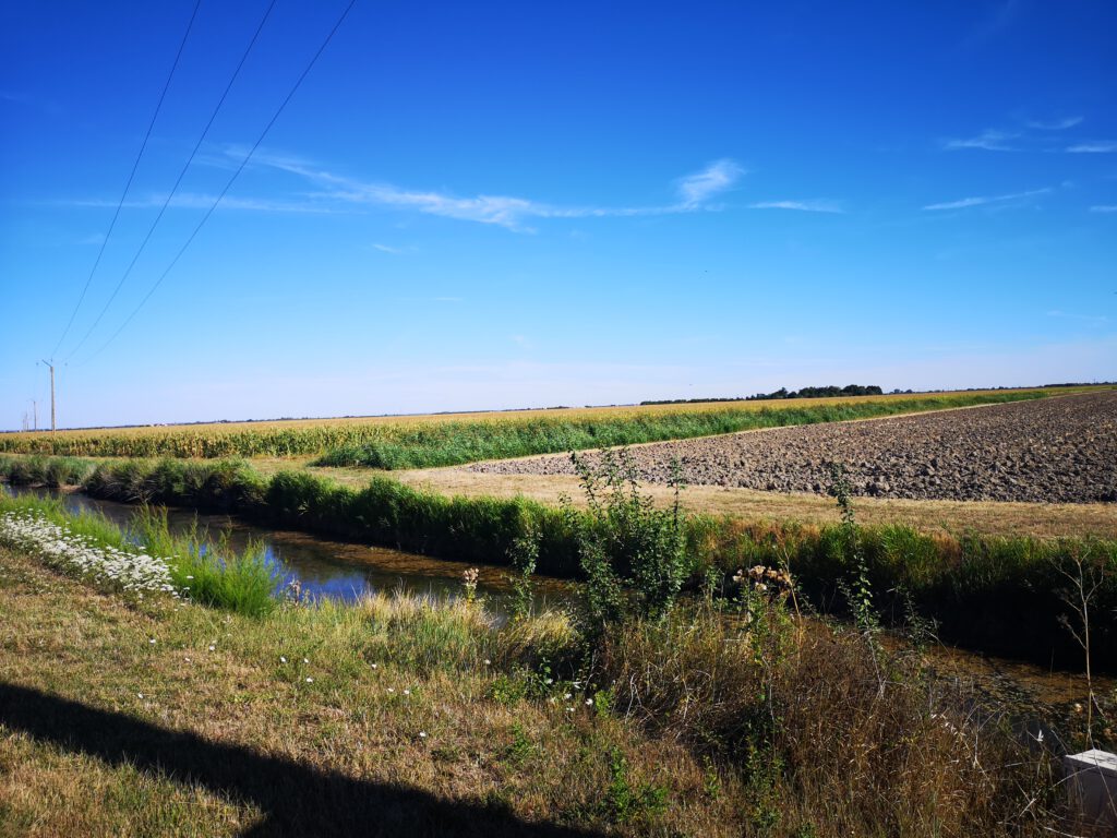Zunächst geht es zurück in den Ort um zum Radweg zurückzukommen, dann führt der EV am Kanal „Maritime de Marans á la mer“ entlang, fein bis grob geschottert – soweit so gut/schlecht – aber teilweise mit hohem Gras Mittelstreifen bewachsenem, so dass für uns wieder einmal kein vollständiger Fahrstreifen zur Verfügung steht – ein Rad muss immer durchs Gras pflügen, links oder rechts – das kostet wieder richtig Körner und geht über ca. 6 – 7 km so.