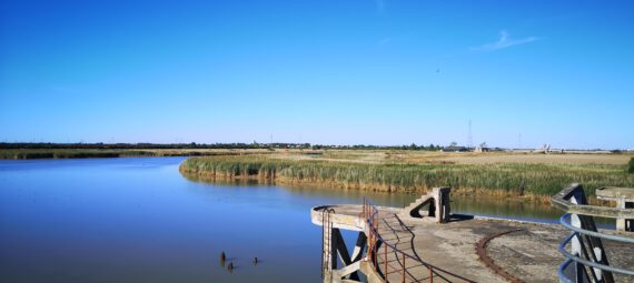 Leider wird es auch anschließend nicht unbedingt gleich besser, weil der Weg auf einem Deich ebenfalls nur mit Kalkschotter belegt ist. Das könnte man eigentlich ganz gut fahren, weil sich die Oberfläche recht gut verdichtet und oberflächig recht glatt wird, wenn man nicht immer wieder gröberen Kalkschotter auf der festgefahrenen Oberfläche hätte. So macht es keinen Spaß.