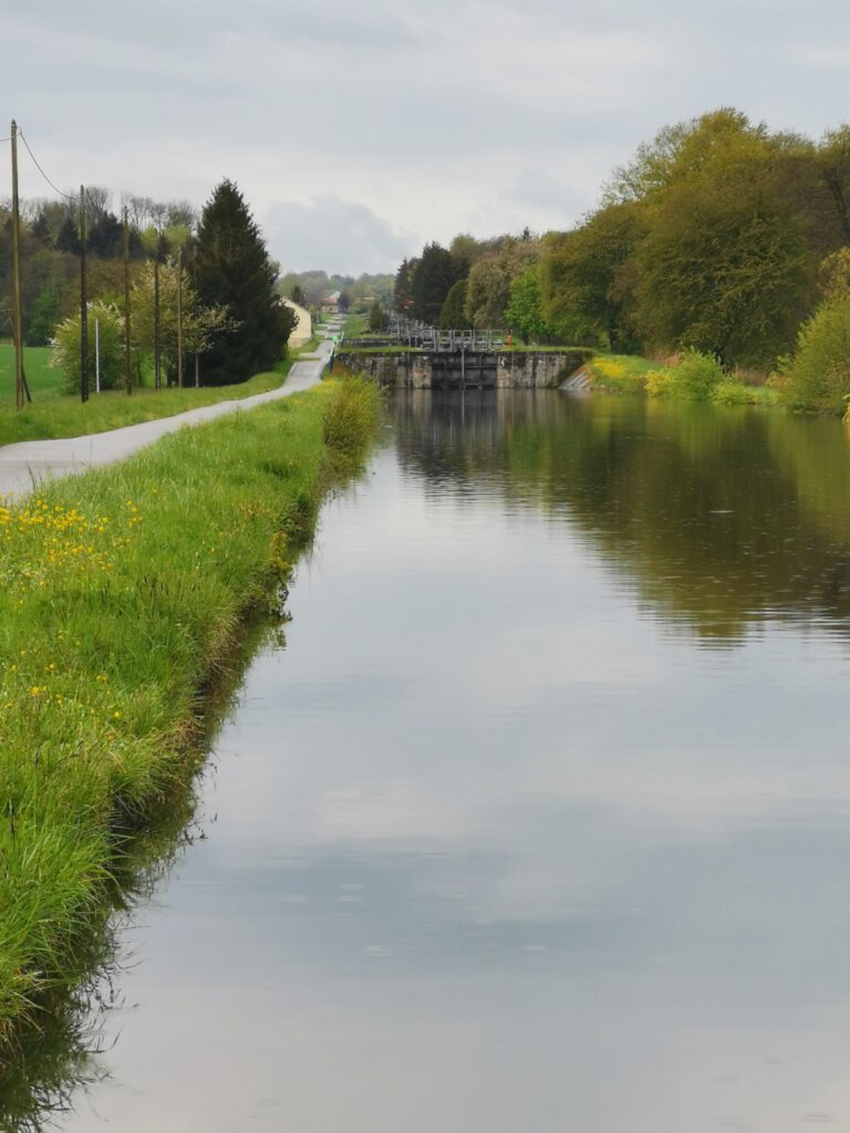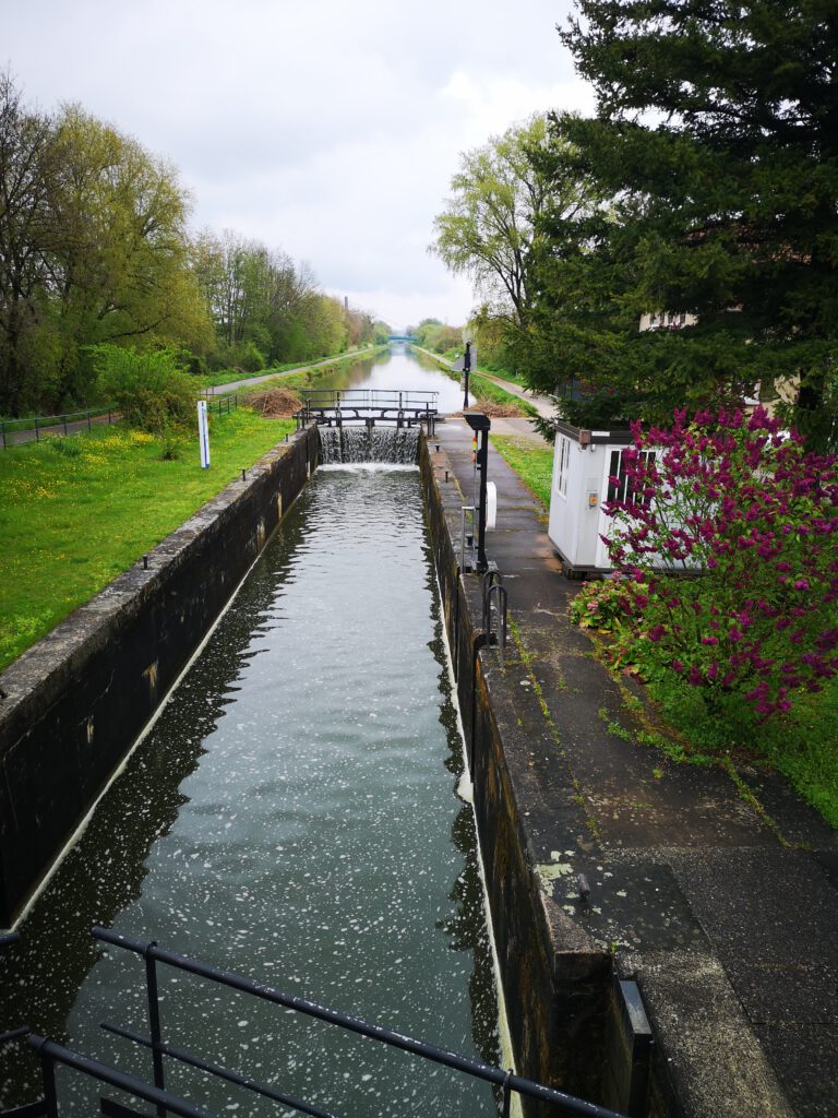 Die teilweise schon fast pitoresken Schleusen sind immer wieder schön anzusehen. Kurz vorher reiht sich hier eine Schleuse an die andere, innerhalb weniger hundert Meter, Das Gleiche dann auf der anderen Seite der Wasserscheide wieder runter. Nach der letzten Schleuse wird die Fahrt deshalb wieder einfacher: von nun an geht es bis auf einen Anstieg durch ein Dorf abseits des Kanals, mehr oder weniger nur noch bergab.