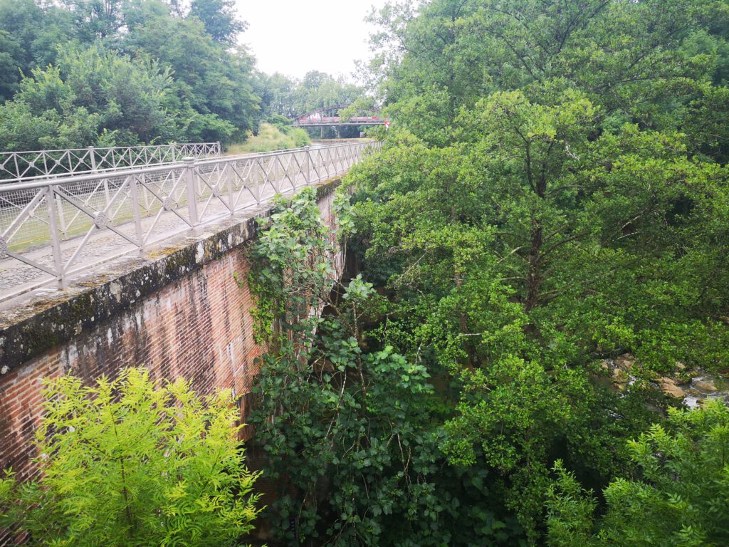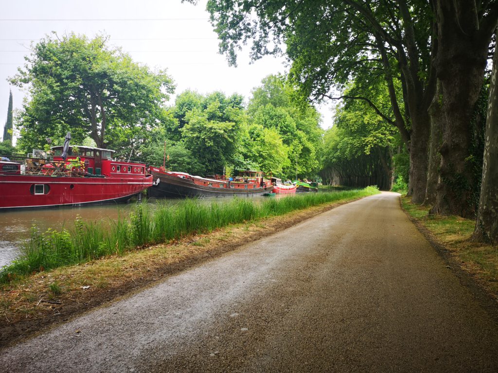 Trotz allem läuft es aber immer noch gut, offensichtlich sind wir hier auch kein so ungewohntes Bild. Am Stadtausgang müssen wir uns dann kurz sortieren und orientieren, die Kreuzung ist etwas unübersichtlich. Danach bekommen wir dann „unseren Weg“ wieder und wir befinden uns am „Canal Latéral à la Garonne“, der uns nun über den heutigen Tag hinaus bis hinter Agen begleiten wird.