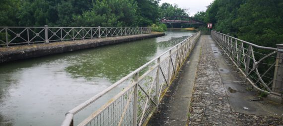 Als wir wieder am „Barrée“ Schild vorbeikommen und dann auf die Hauptstraße einbiegen sehen wir auch den „Umleitungswunsch“: über die Berge – wie gut, dass uns der Brouter eine mehr oder weniger Höhenmeter freie Umleitung zeigt. Die führt hier zwar über ein paar Kilometer wieder über eine „D“, aber es sind nur wenige Autos unterwegs. Ein kurzes Stück parallel bzw. hinter der Brückenbaustelle, kehren wir wieder an den Kanalweg zurück.