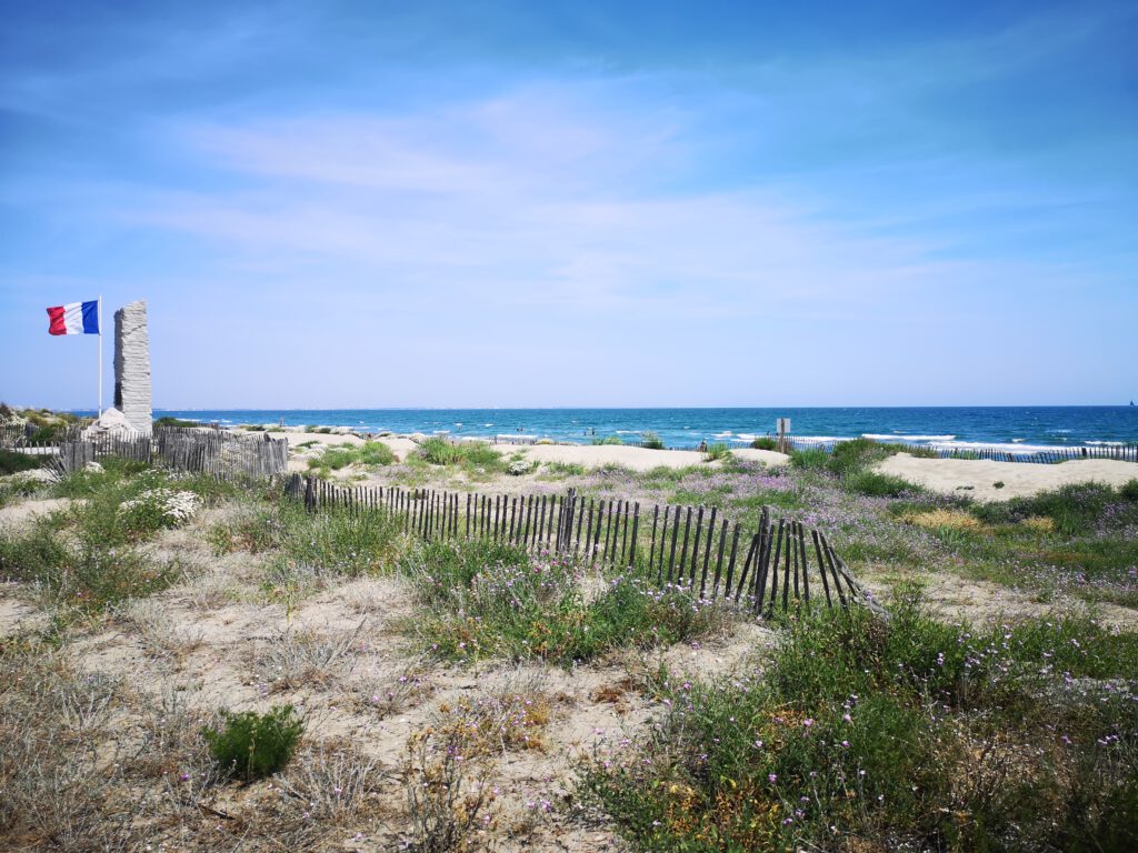 Aber auch das haben wir gemeistert und erreichen nach 62 km um halb vier endlich den Platz „Camping Montpellier Plage“ kurz vor „Palavas-les-Flots“. Ein echt großer Platz, aktuell aber noch nicht sonderlich stark belegt. Wir bauen erstmal das Zelt auf, ziehen uns dann die hier leider notwendigen „Badeklamotten“ an und gehen zum Strand zum ersten Bad im Mittelmeer. Herrlich!