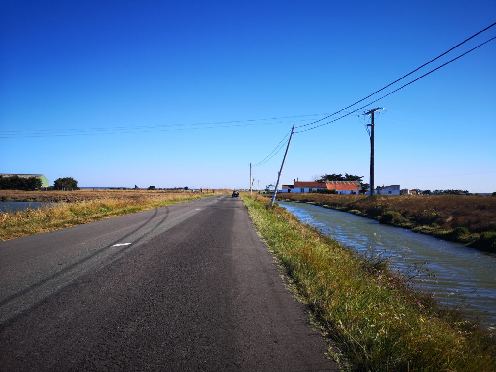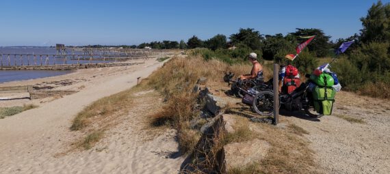Wir sind wieder auf kleinen und kleinsten Straßen unterwegs, die sich gut fahren lassen. Als wir jedoch auf „Le Clion-sur-mer“ zufahren wollen, wird der Asphalt zu einem Schotterweg – was hat uns der Brouter hier wieder rausgesucht? Hier spricht uns ein Anwohner der Straße, der gerade draußen am Arbeiten ist, an. Zunächst auf französisch, was wir nicht ganz richtig interpretieren können. Als er merkt, dass wir nicht verstehen, fragt er, ob wir englisch verstehen und er erklärt uns dann, dass wir mit unseren Rädern am Ende nicht durchkommen werden, weil dort ein großes Hindernis liegt und erklärt uns dann, wie wir weiterkommen können – wirklich supernett und erspart uns entweder einen Weg (weil wir zurück müssten), oder sogar den Versuch am Hindernis durch ab- und wieder aufpacken vorbeizukommen.